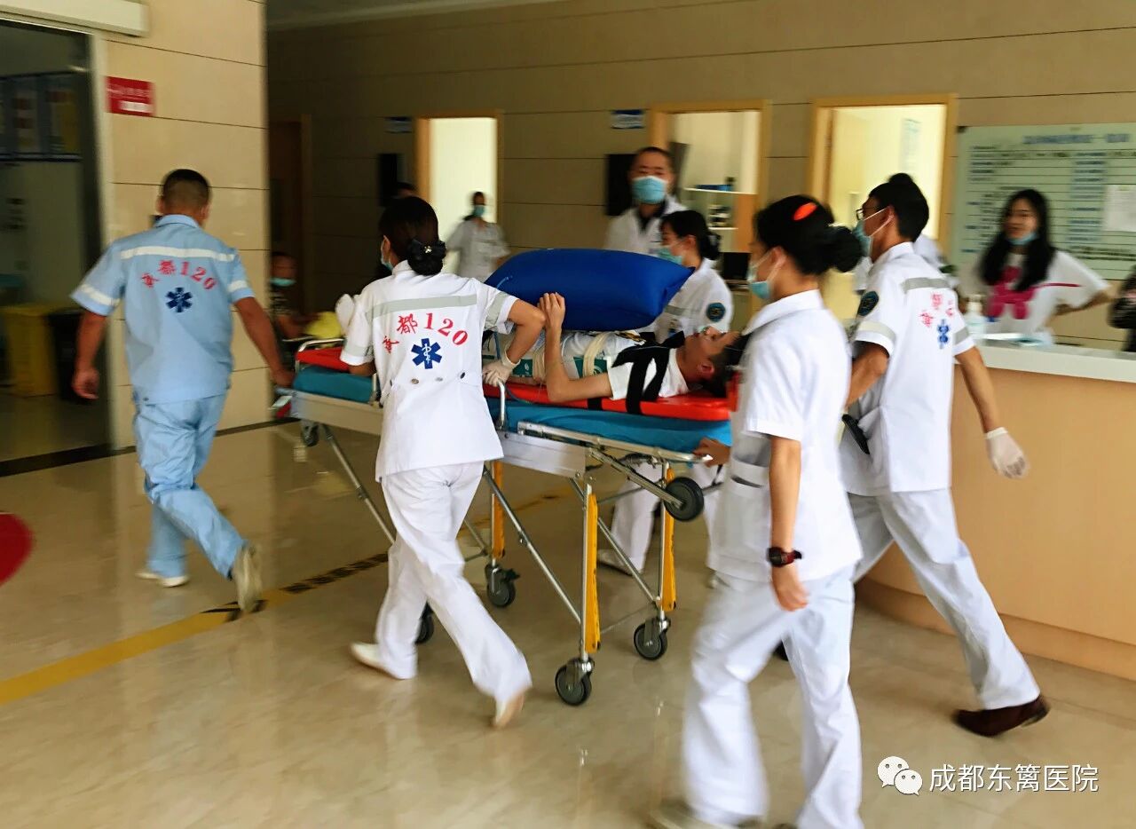 2020年8月27日下午14点30分,急救演练正式开始,四川省人民医院东篱医院急诊科接到120中心电话,杉板桥南一街发生车祸,两车相撞,具体伤亡人数不详。总值班汇报后,现场总指挥立即命令启动突发事件应急预案。急诊科接到报告后,迅速组织急救人员出车,共调拨两辆救护车先后赶赴车祸现场。
