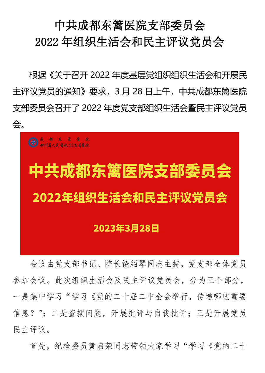 中共成都东篱医院支部委员会 2022 年组织生活会和民主评议党员会